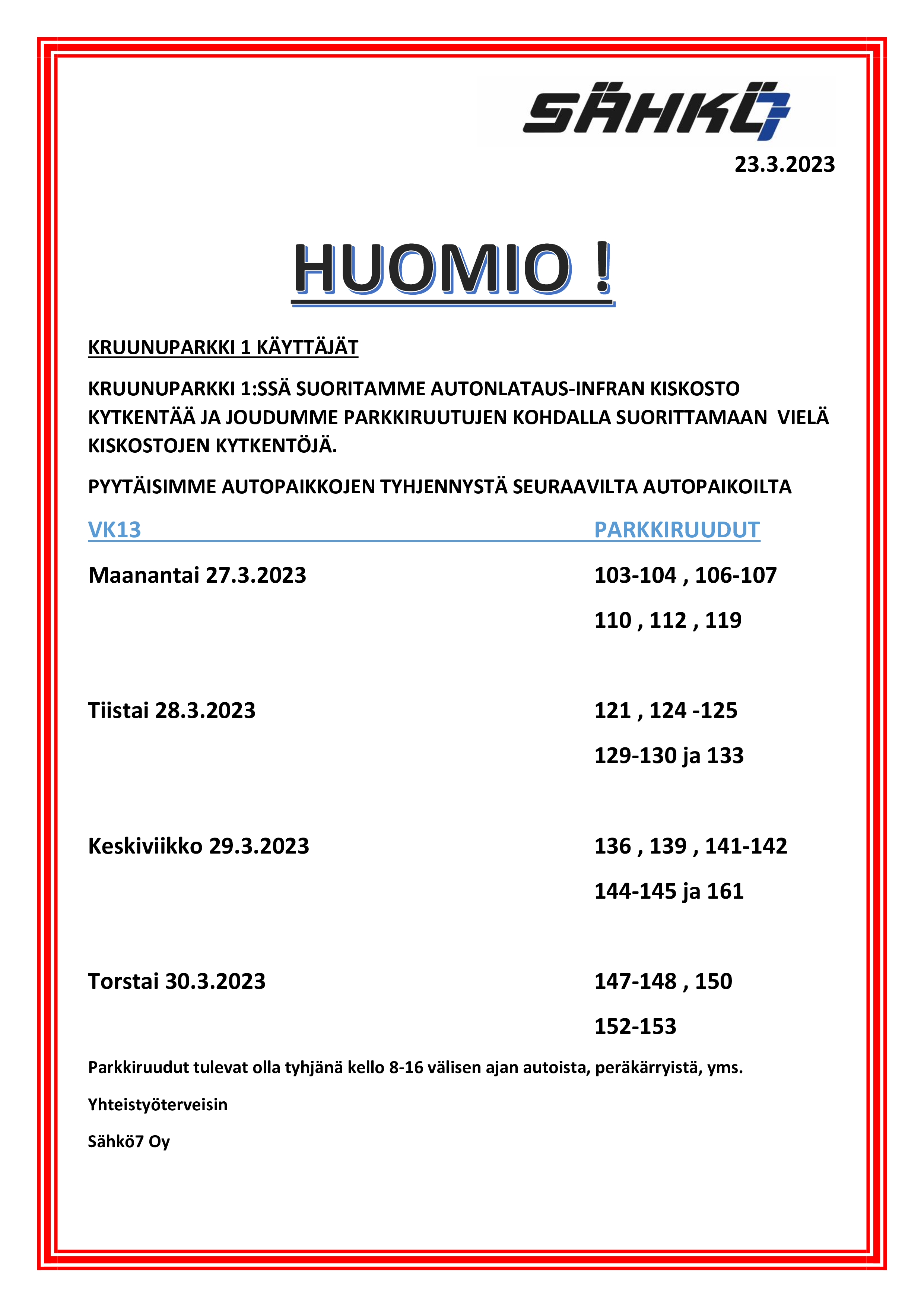 TIEDOTE KRUUNUPARKKI 1 SÄHKÖAUTOJEN LATAUSINFRAHANKE JA AUTOJEN SIIRTOPYYNTÖ VIIKOLLA 13